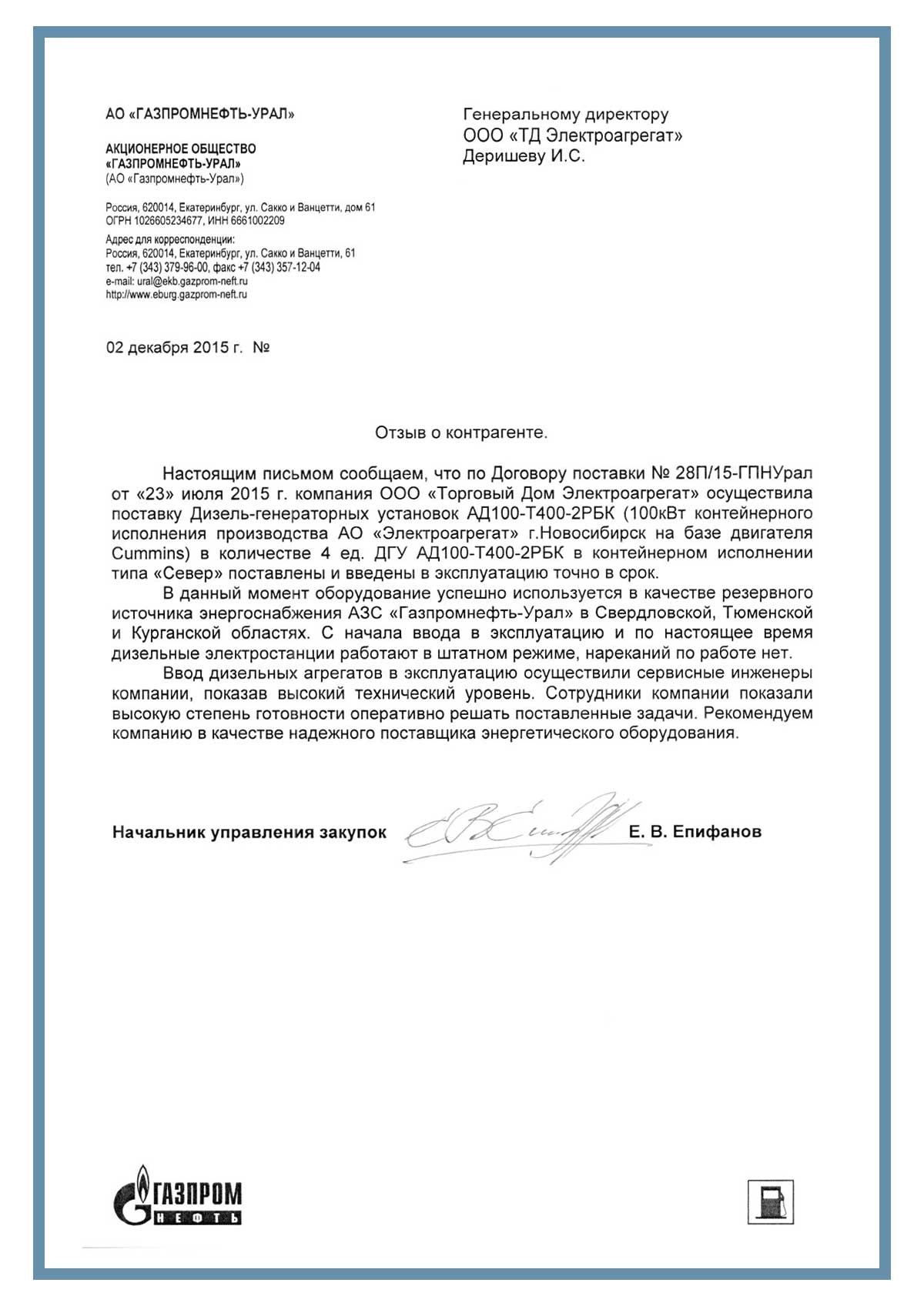 Настоящим письмом сообщаем, что по Договору поставки № 28П/15-ГПНУрал от «23» июля 2015 г. завод «Торговый Дом Электроагрегат» осуществила поставку Дизель-генераторных установок АД100-Т400-2РБК в количестве 4 ед. ДГУ АД100-Т400-2РБК в контейнерном исполнении  типа «Север» поставлены и введены в эксплуатацию точно в срок.