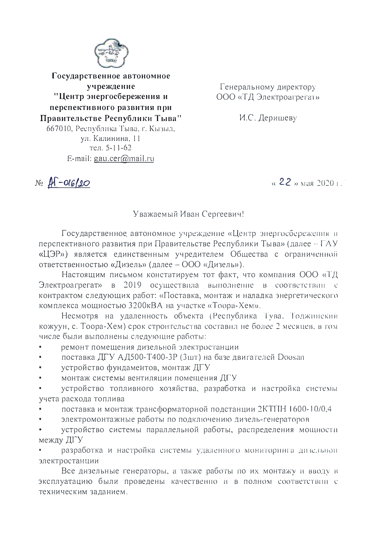 [ALT] => Отзыв контрагентов о компании ООО «ТД Электроагрегат» и исполненном проекте для ГАУ "Центр энергосбережения и перспективного развития при Правительстве Республики Тыва"