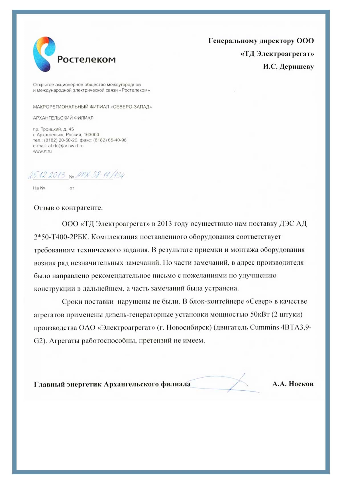 [ALT] => Отзыв контрагентов о компании ООО «ТД Электроагрегат» и исполненном проекте для ОАО "Ростелеком" г. Архангельск